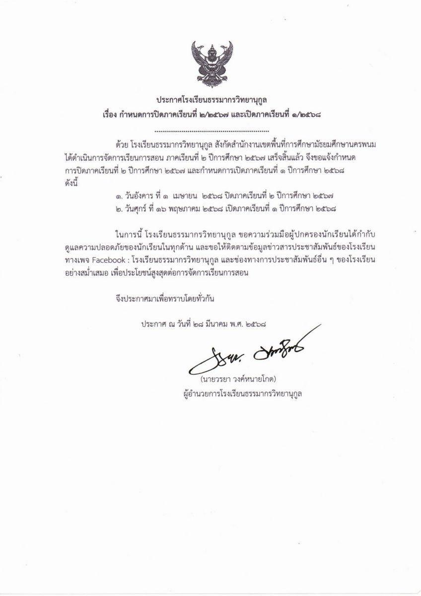 ประกาศปิดเทอมภาคเรียนที่ 2/2567 และเปิดภาคเรียนที่ 1/2568 โรงเรียนธรรมากรวิทยานุกูล