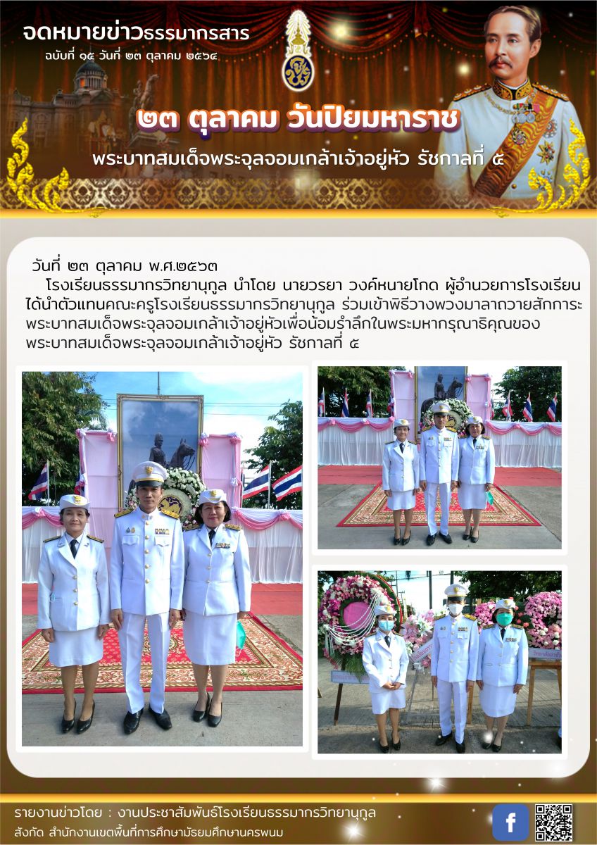 โรงเรียนธรรมากรวิทยานุกูล นำโดย นายวรยา วงค์หนายโกด ผู้อำนวยการโรงเรียนได้นำตัวแทนคณะครูโรงเรียนธรรมากรวิทยานุกูล ร่วมเข้าพิธีวางพวงมาลาถวายสักการะพระบาทสมเด็จพระจุลจอมเกล้าเจ้าอยู่หัวเพื่อน้อมรำลึกใน