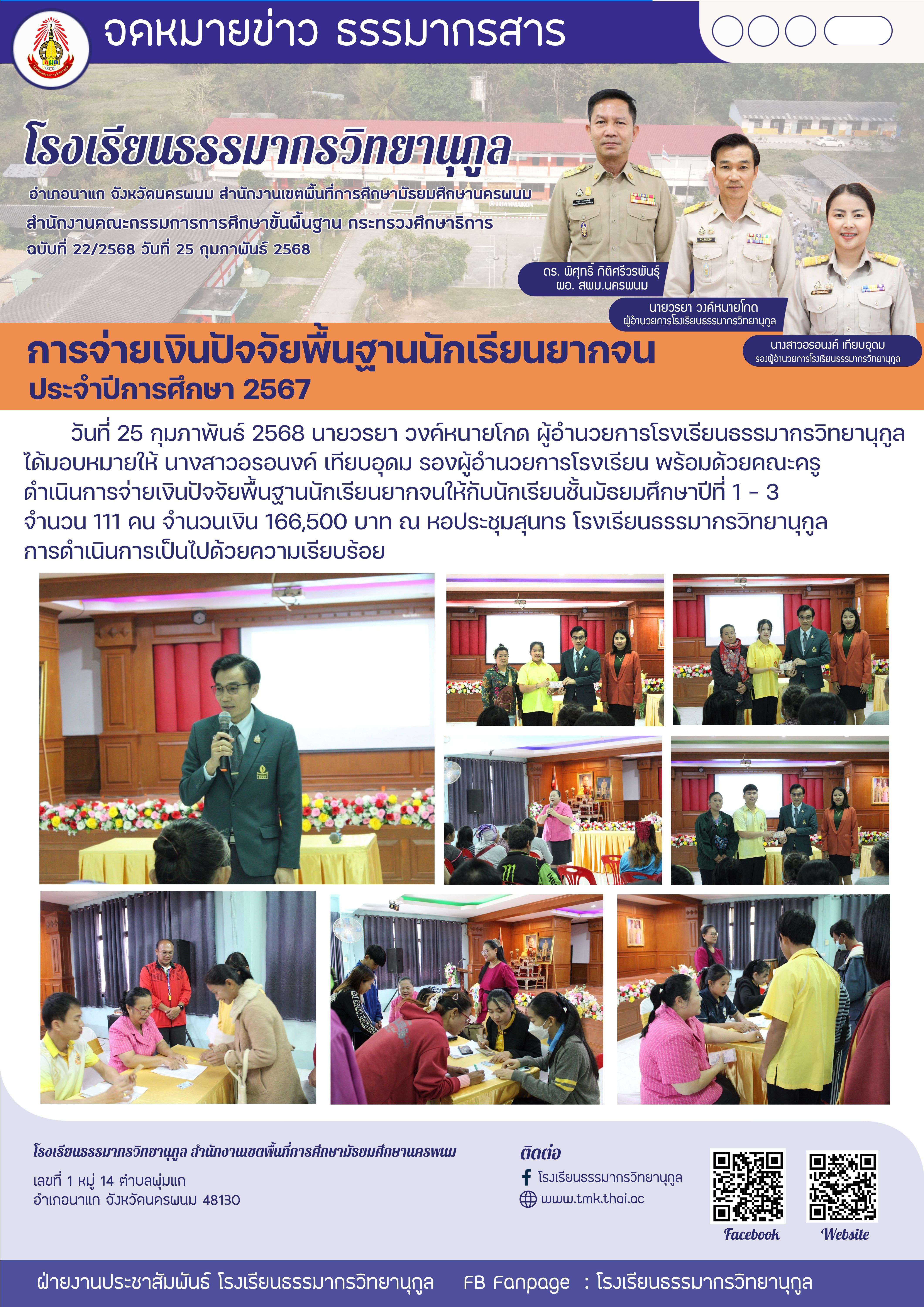 การจ่ายเงินปัจจัยพื้นฐานนักเรียนยากจน ประจำปีการศึกษา 2567