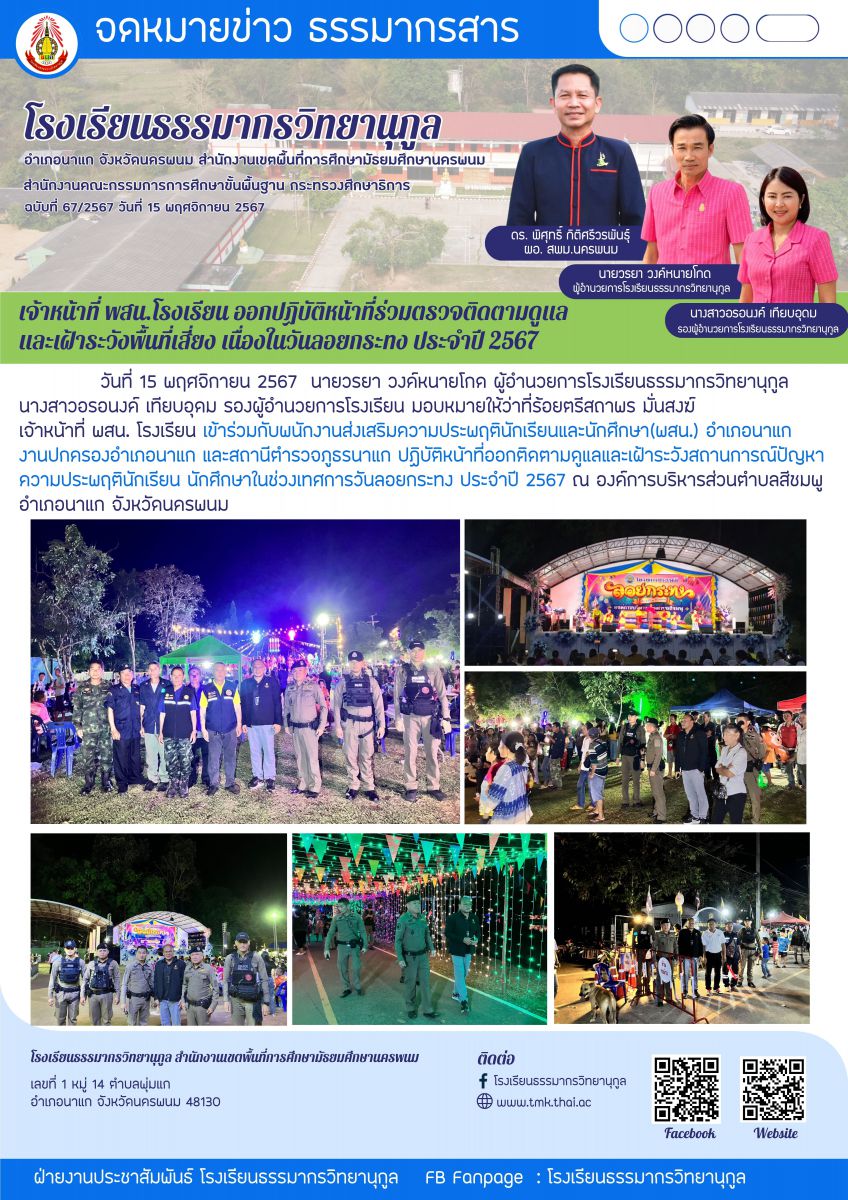 เจ้าหน้าที่ พสน.โรงเรียน ออกปฏิบัติหน้าที่ร่วมตรวจติดตามดูแล และเฝ้าระวังพื้นที่เสี่ยง เนื่องในวันลอยกระทง ประจำปี 2567