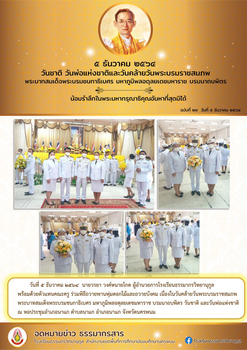 โรงเรียนธรรมากรวิทยานุกูล ร่วมพิธีถวายพานพุ่มดอกไม้และถวายบังคม เนื่องในวันคล้ายวันพระบรมราชสมภพ พระบาทสมเด็จพระบรมชนกาธิเบศร มหาภูมิพลอดุลยเดชมหาราช บรมนาถบพิตร วันชาติ และวันพ่อแห่งชาติ