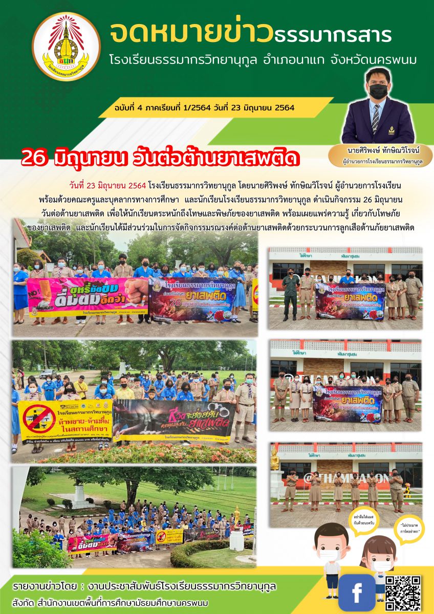 โรงเรียนธรรมากรวิทยานุกูล ดำเนินกิจกรรม 26 มิถุนายน วันต่อต้านยาเสพติด เพื่อให้นักเรียนตระหนักถึงโทษและพิษภัยของยาเสพติดพร้อมเผยแพร่ความรู้ เกี่ยวกับโทษภัย ของยาเสพติด