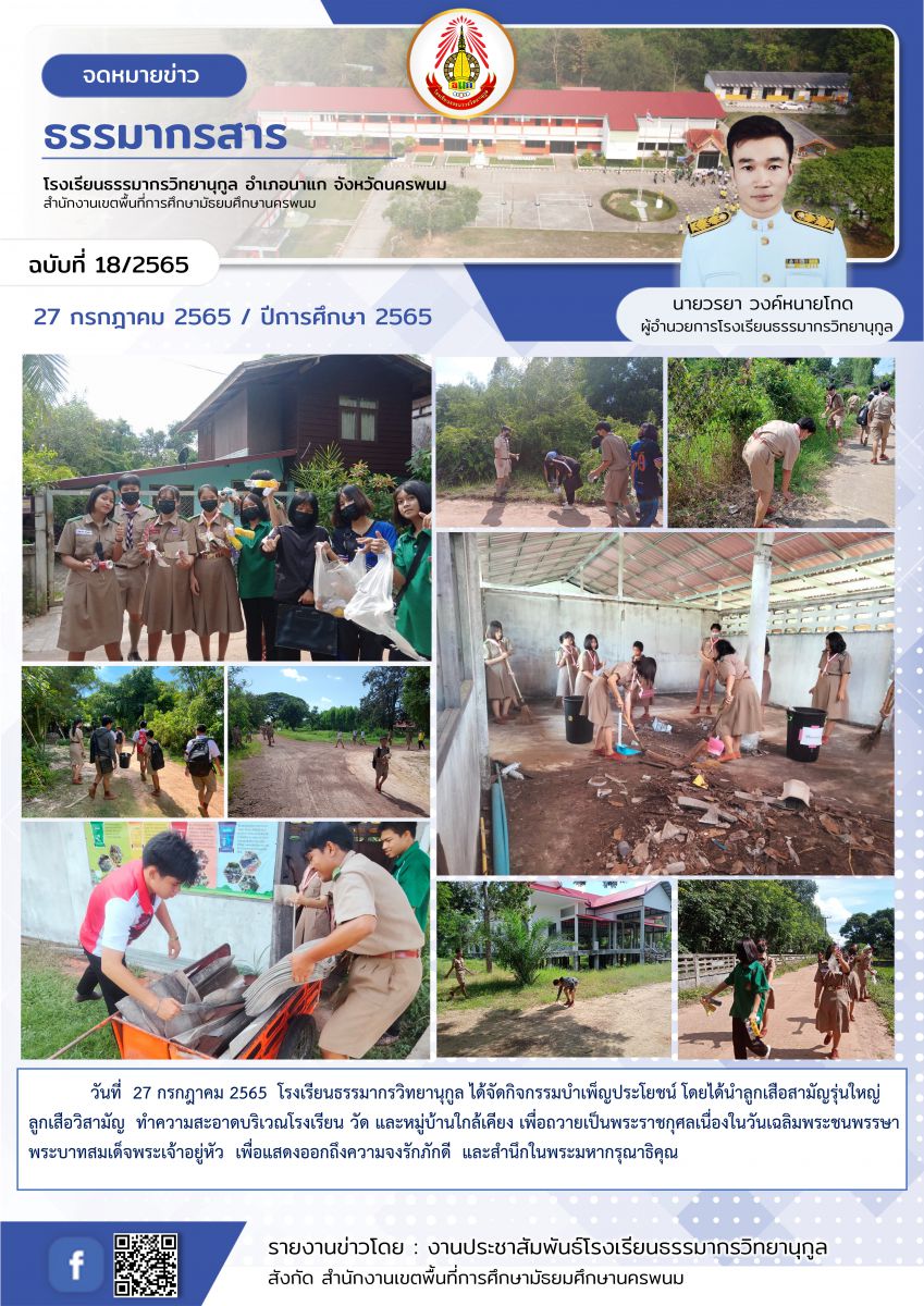 โรงเรียนธรรมากรวิทยานุกูล ได้จัดกิจกรรมบำเพ็ญประโยชน์ โดยได้นำลูกเสือสามัญรุ่นใหญ่ ลูกเสือวิสามัญ ทำความสะอาดบริเวณโรงเรียน วัด และหมู่บ้านใกล้เคียง