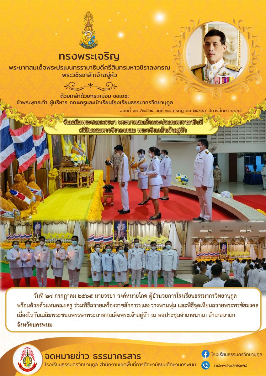 นายวรยา วงค์หนายโกด ผู้อำนวยการโรงเรียน พร้อมด้วยตัวแทนคณะครู ร่วมพิธีถวายเครื่องราชสักการะและวางพานพุ่ม และพิธีจุดเทียนถวายพระพรชัยมงคล เนื่องในวันเฉลิมพระชนมพรรษาพระบาทสมเด็จพระเจ้าอยู่หัว