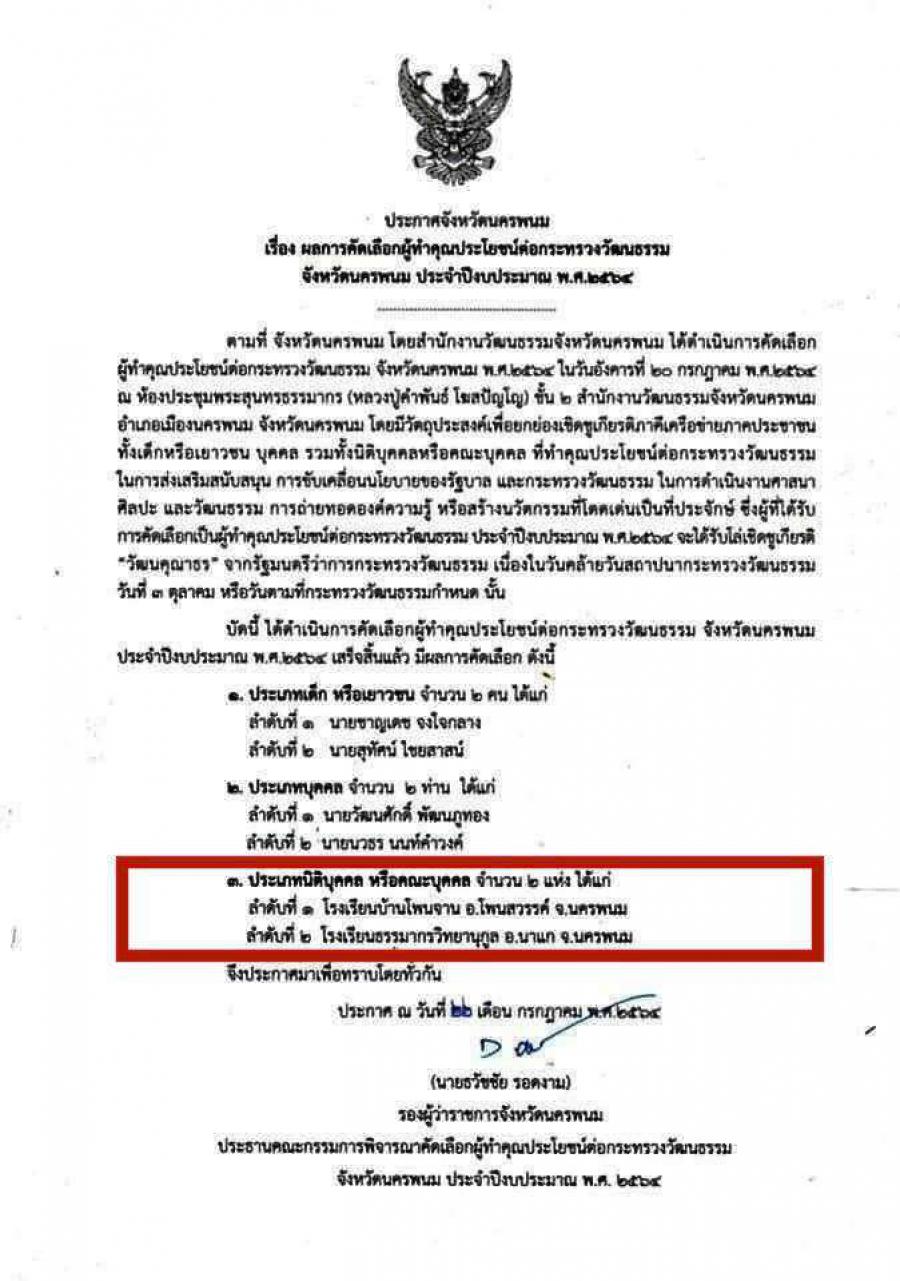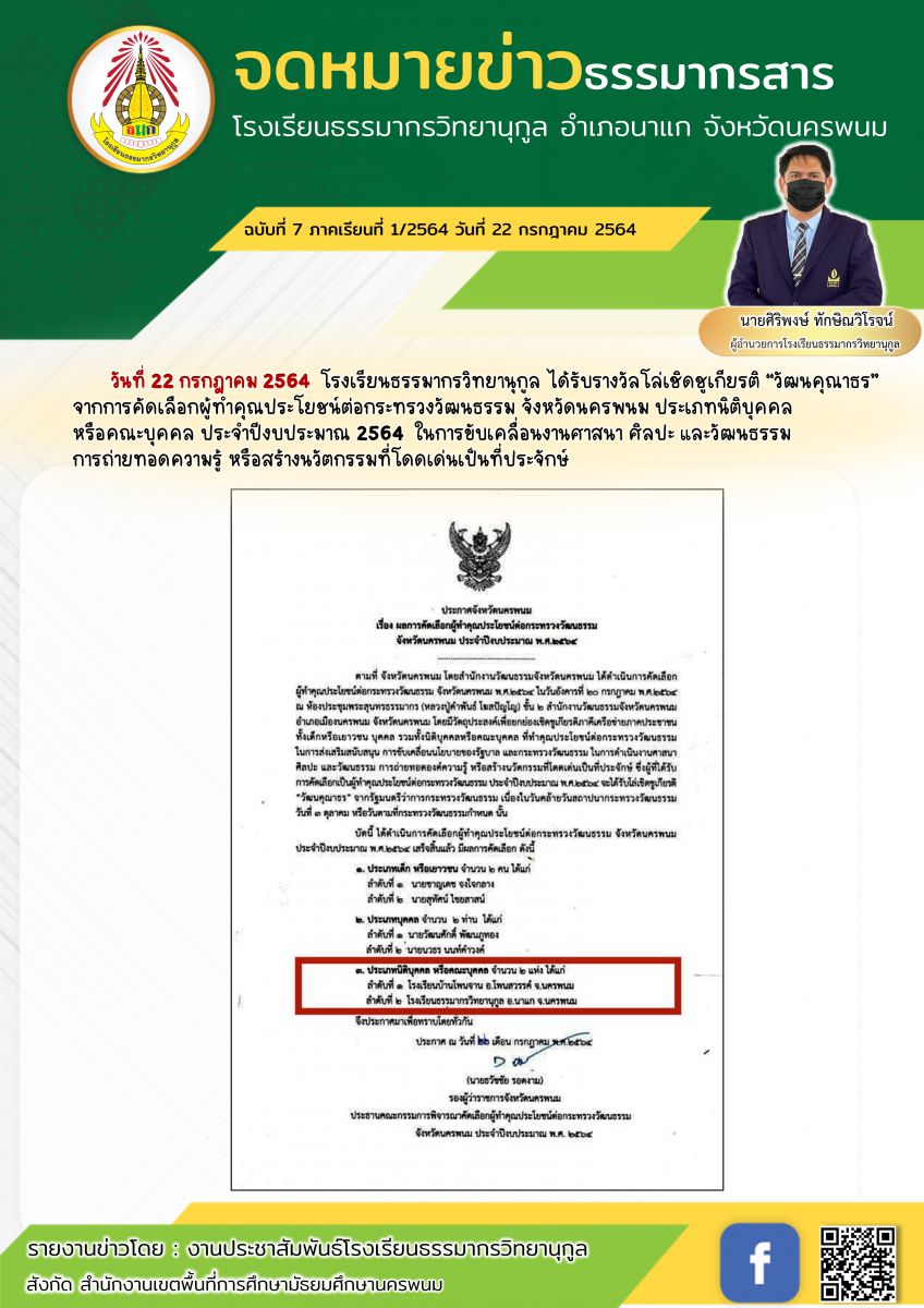 โรงเรียนธรรมากรวิทยานุกูล ได้รับรางวัลโล่เชิดชูเกียรติ "วัฒนคุณาธร" จากการคัดเลือกผู้ทำคุณประโยชน์ต่อกระทรวงวัฒนธรรม จังหวัดนครพนม ประเภทนิติบุคคล หรือคณะบุคคล ประจำปีงบประมาณ 2564