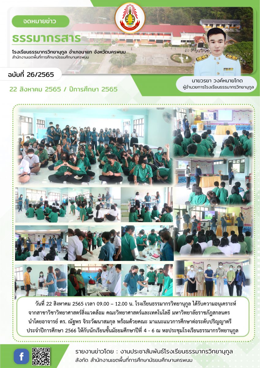 โรงเรียนธรรมากรวิทยานุกูล ได้รับความอนุเคราะห์ จากสาขาวิชาวิทยาศาสตร์สิ่งแวดล้อม คณะวิทยาศาสตร์และเทคโนโลยี มหาวิทยาลัยราชภัฎสกลนคร มาแนะแนวการศึกษาต่อ