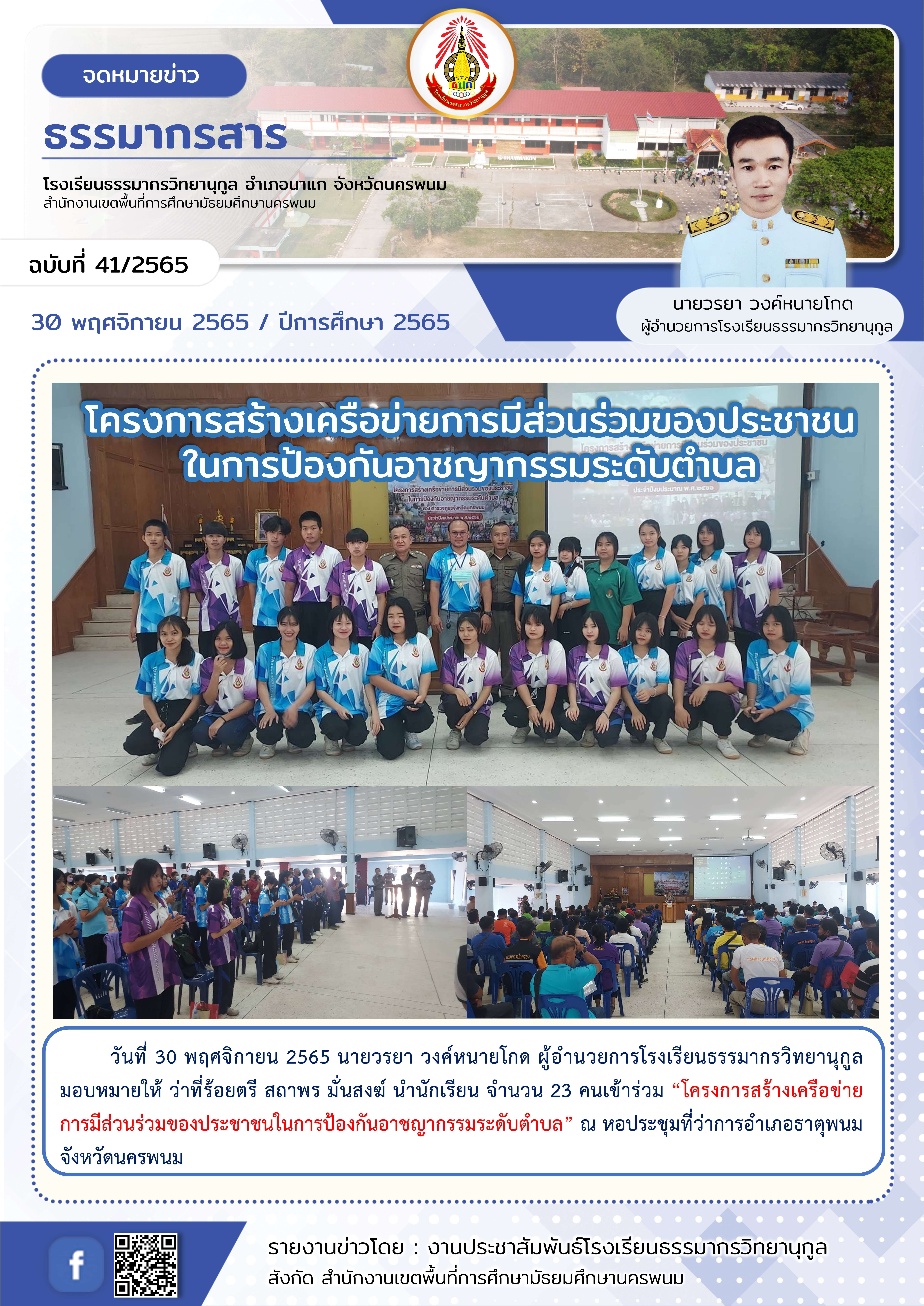 นักเรียน จำนวน 23 คนเข้าร่วม โครงการสร้างเครือข่ายการมีส่วนร่วมของประชาชนในการป้องกันอาชญากรรมระดับตำบล ณ หอประชุมที่ว่าการอำเภอธาตุพนม จังหวัดนครพนม
