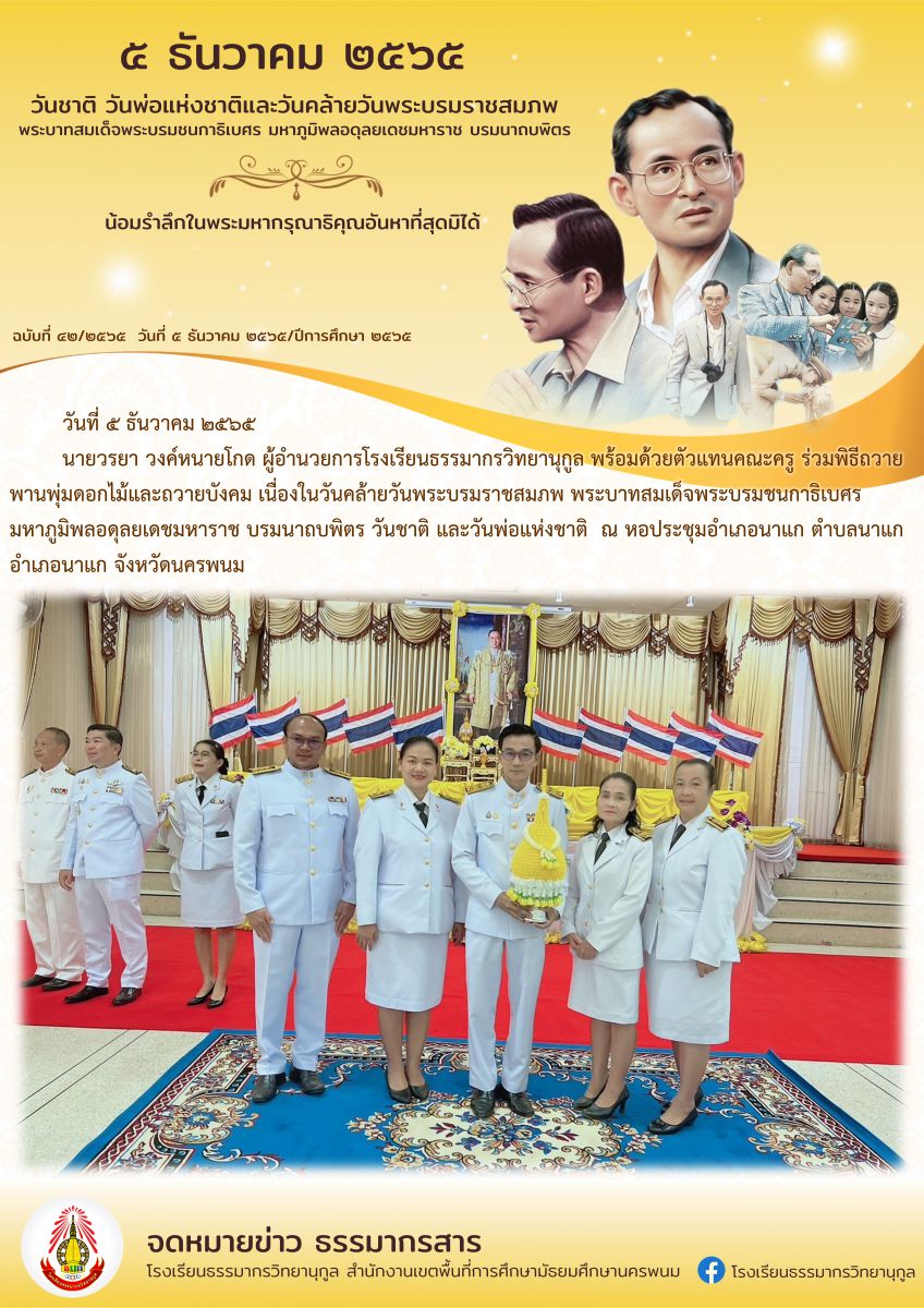 โรงเรียนธรรมากรวิทยานุกูล ร่วมพิธีถวายพานพุ่มดอกไม้และถวายบังคม เนื่องในวันคล้ายวันพระบรมราชสมภพ พระบาทสมเด็จพระบรมชนกาธิเบศร มหาภูมิพดุลยเดชมหาราช บรมนาถบพิตร วันชาติ และวันพ่อแห่งชาติ