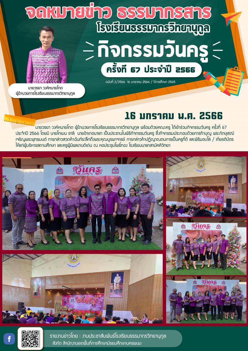 เข้าร่วมกิจกรรมวันครู ครั้งที่ 67 ประจำปี 2566 ณ หอประชุมโพธิ์ทอง โรงเรียนนาแกสามัคคีวิทยา