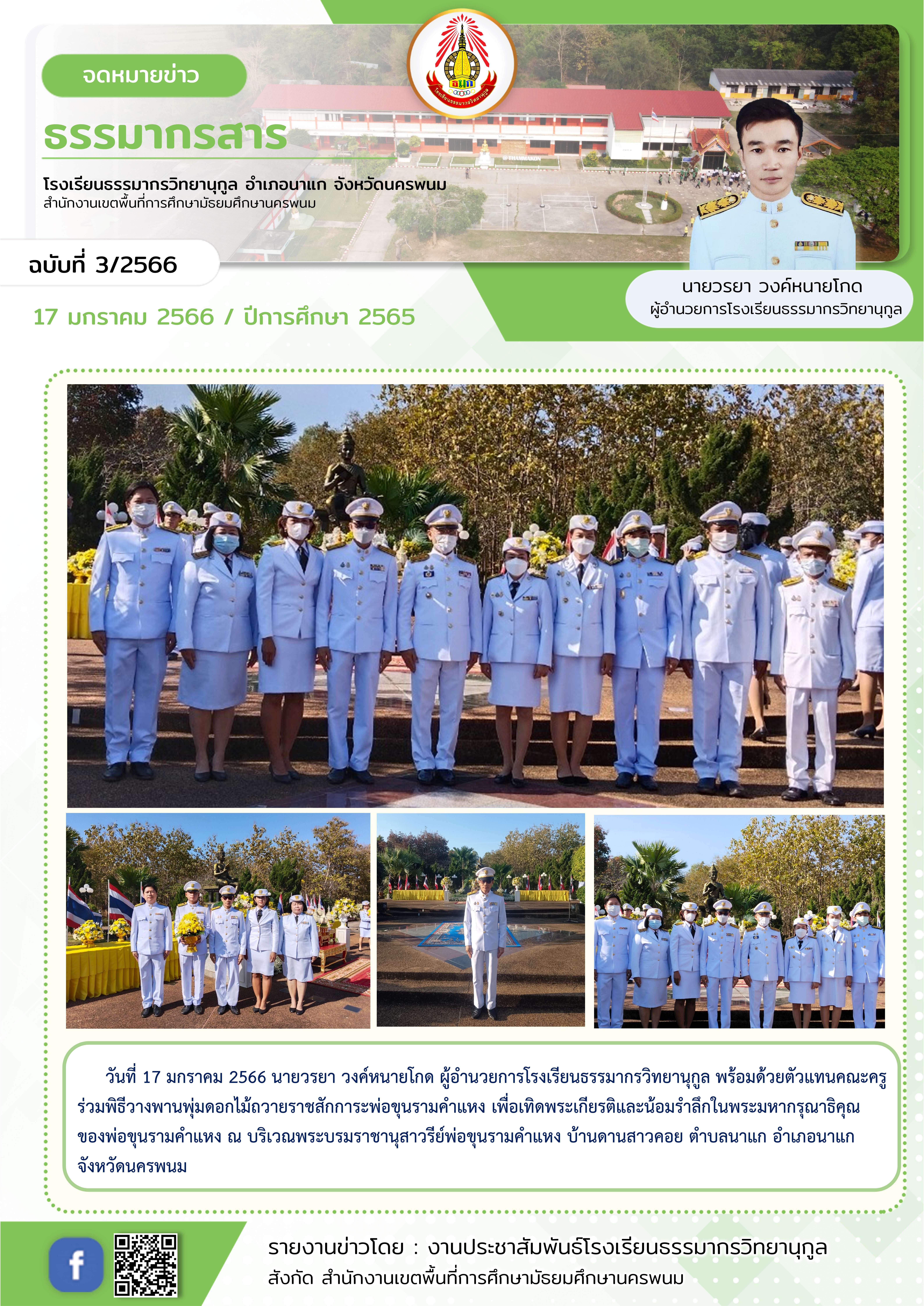 ร่วมพิธีวางพานพุ่มดอกไม้ถวายราชสักการะพ่อขุนรามคำแหง เพื่อเทิดพระเกียรติและน้อมรำลึกในพระมหากรุณาธิคุณของพ่อขุนรามคำแหง ณ บริเวณพระบรมราชานุสาวรีย์พ่อขุนรามคำแหง บ้านดานสาวคอย ตำบลนาแก อำเภอนาแก จังหว